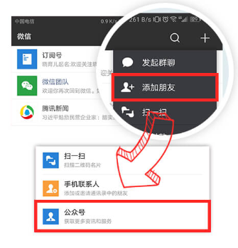 打开微信,点击右上角“+”,再点击“添加朋友”,选择“公众号”粘贴